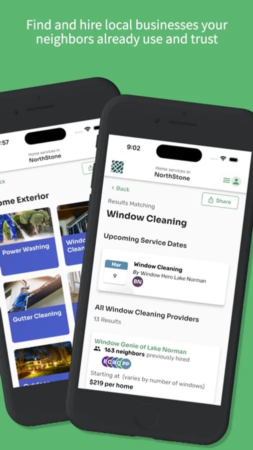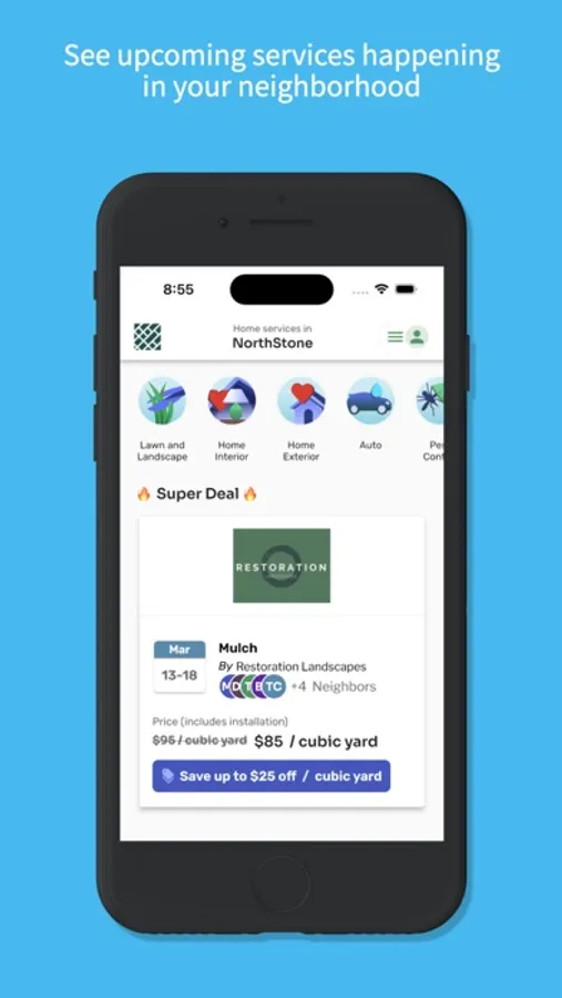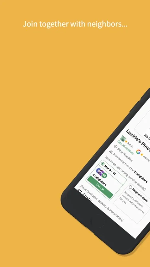 An online marketplace for neighborhoods that allows users to find and hire local home maintenance businesses based on who their neighbors already use and trust. Users can see the top local companies that do work in the neighborhood and join in on upcoming services already scheduled by their neighbors. As more neighbors sign up for the same service,the price goes down for everyone (group discount). Consumers get high quality services based on recommendations from their neighbors, Service Providers gain efficiency through route density (customers that live close together), and collectively neighborhoods can reduce traffic and lower their carbon footprint!