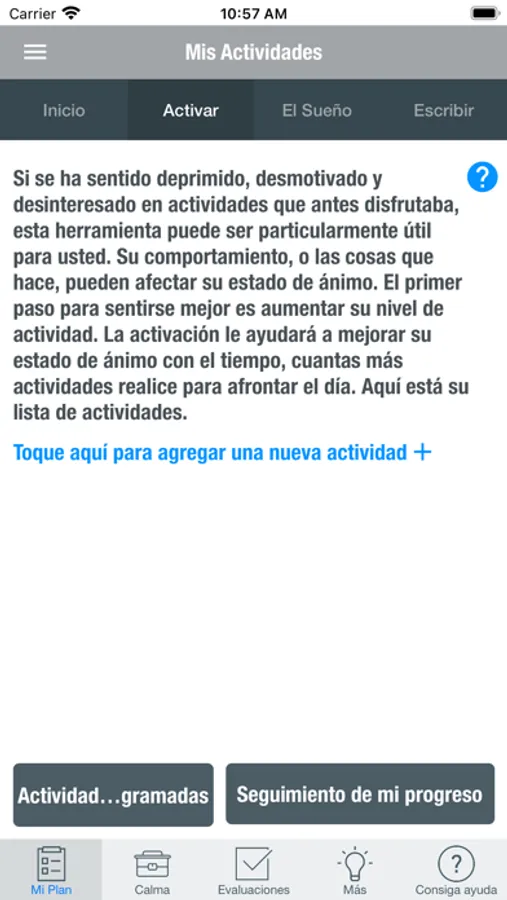 - Mecanismos de ayuda efectivos, incluyendo habilidades de relajación, mindfulness (atención plena), programación de actividades placenteras, monitoreo y mejora del sueño, notas sobre su experiencia y herramientas para controlar el estrés y la ansiedad.