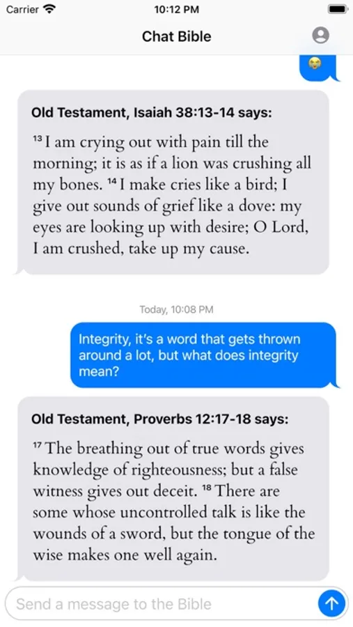 Discover a whole new way to read an experience the Holy Scriptures: Chat with the Bible! Get your answers directly from the Word of God. Dive deeper into the context of each chapter through your answers.