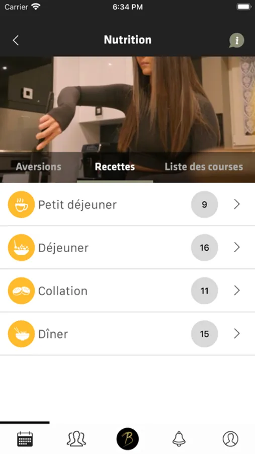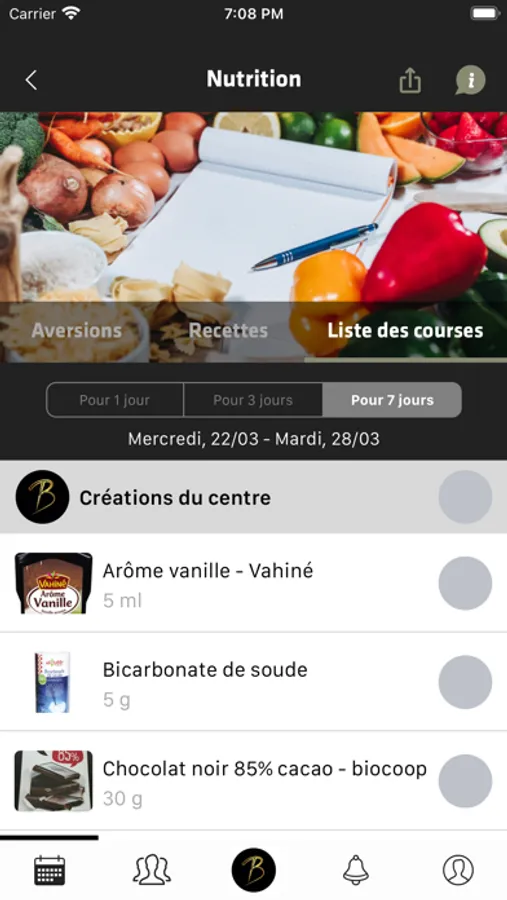 L'onglet nutrition + permettra de renseigner vos aversions alimentaires, que vous pourrez ensuite partager à votre coach. Des variantes des aliments vous seront proposées pour remplacer ces mêmes aliments sélectionnés. Vous aurez également accès à la liste de vos recettes et enfin à votre liste de courses qui s'adaptera tout autant, en temps réel, aux repas ajoutés à votre planning.