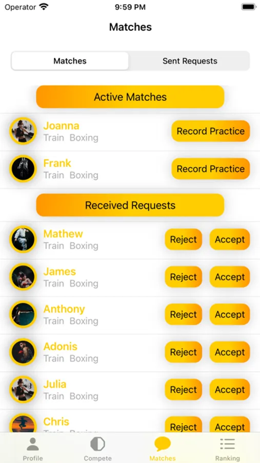 - The main feature is the matchmaking system, which matches fighters based on their preferred martial art and location. This helps users find opponents and training partners with similar skill and interests.