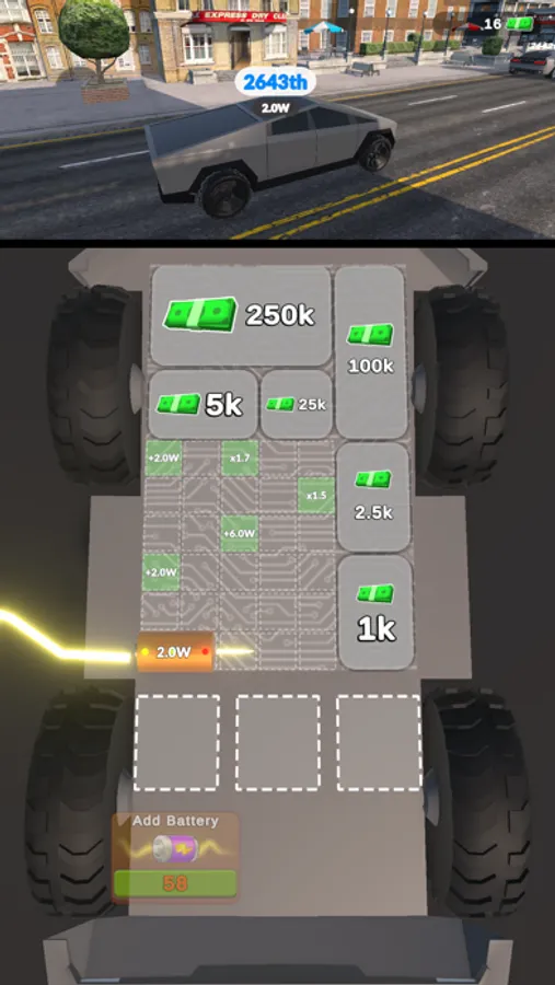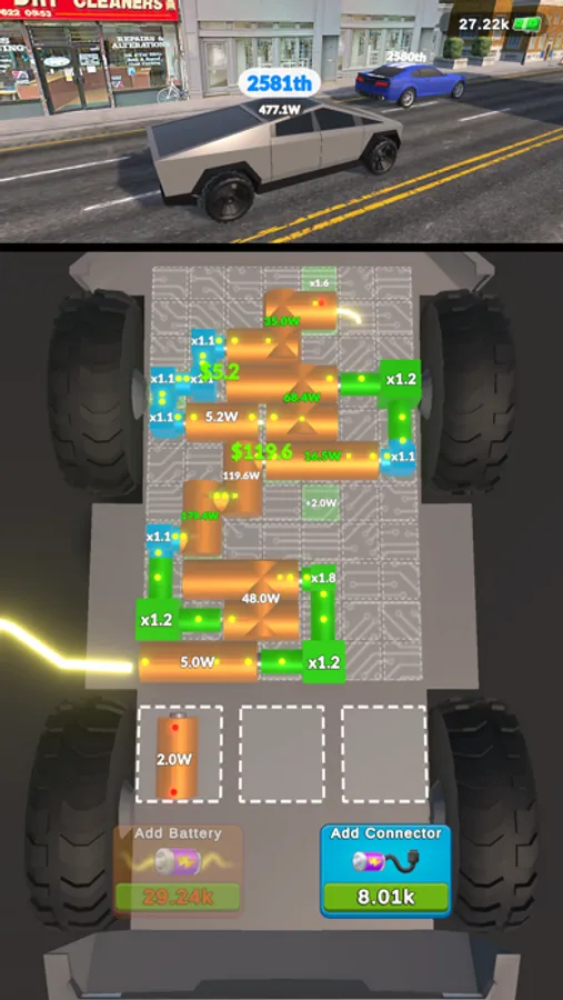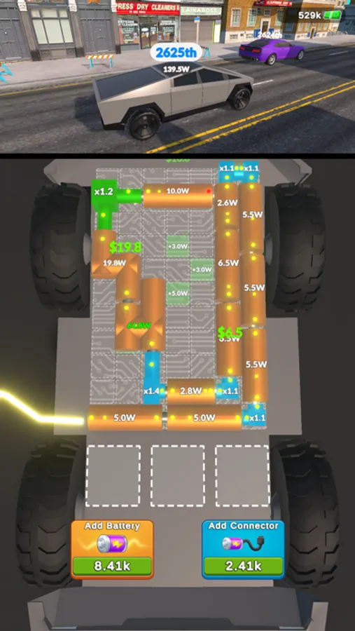 Are you ready to power up your electric car? In this puzzle simulation game, you arrange your cars batteries and connectors to generate maximum power and go as fast as you can with your electric car!