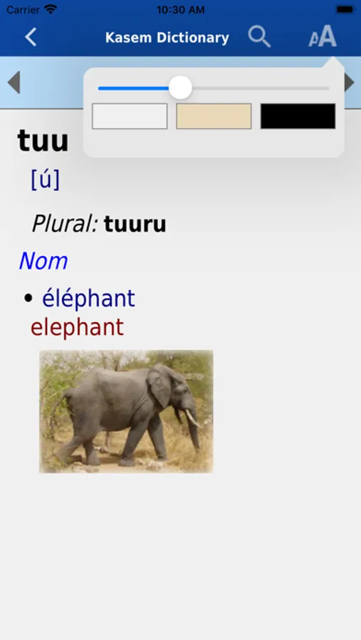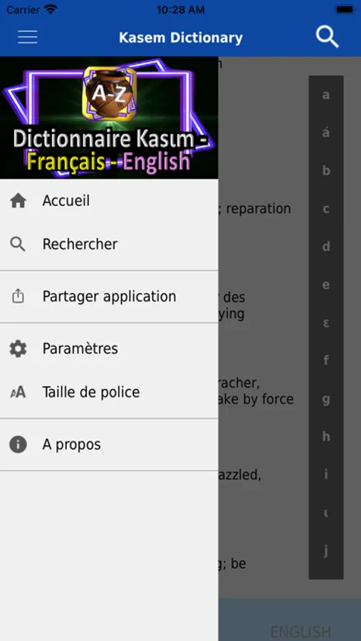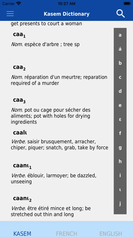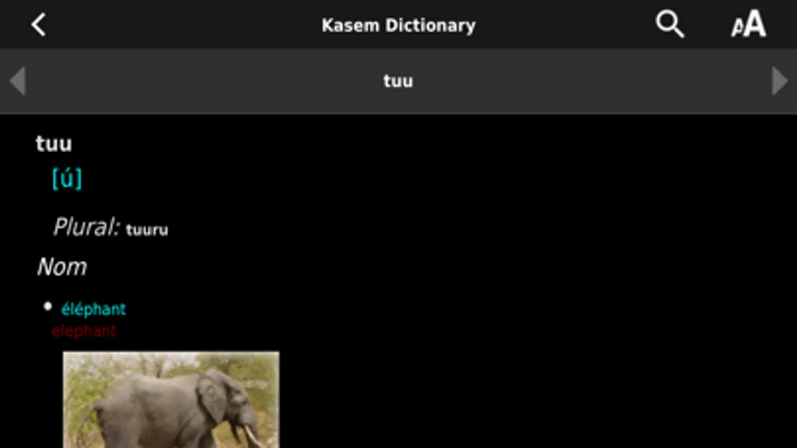 This dictionary allows you to discover the Kasem language of Burkina Faso. By clicking on the “search” button (the small magnifying glass at the top right), a window opens and you can type words in Kassem, French or English. Type "Search" and a new window will display the results. Select the word you want to consult closely, and a new window will open on your screen.