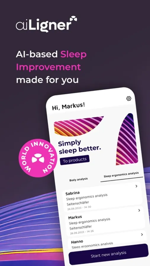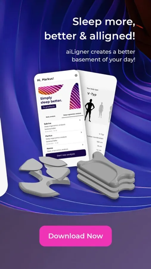 aiLigner is a world first that uses photos to detect body shape and posture type and uses innovative AI technology to give you recommendations for anatomically optimal sleep ergonomics in bed. With aiLigner, you say goodbye to tension, restlessness and poor sleep.