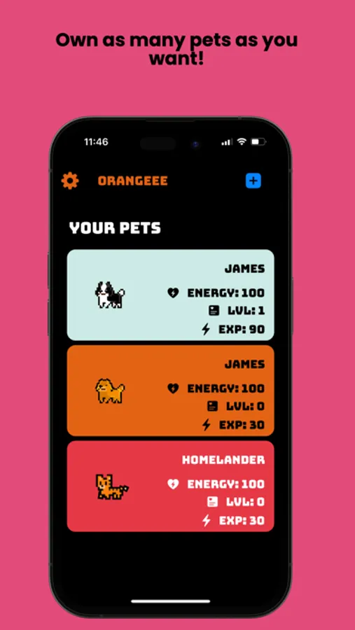Orangeee allows you to own virtual pets, spend quality time playing and gaining XP with them, and watch them grow!