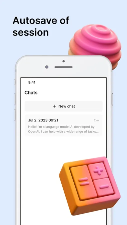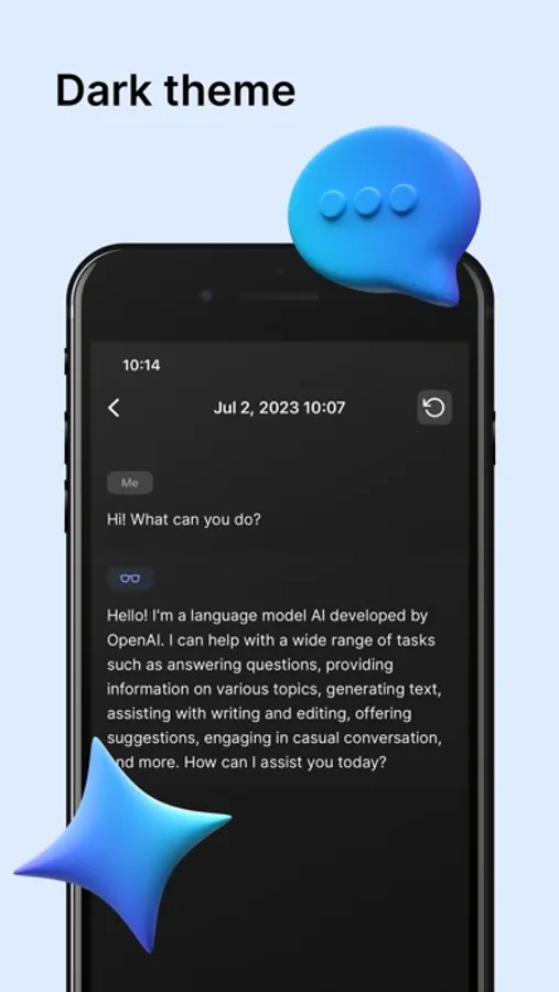 App contains many features and constantly develops further. All your communications can be saved, so you can later return to them or start a new chat if you don't want to mess up the context in previous one. If you don't need that dialog any more, with a swipe gesture you can delete it any time (Notion: all information only stored on your device, we respect your privacy) . A great choice of predefined templates are present on the catalog page of app, you just have to fill in the information and you will get the most suitable answer.