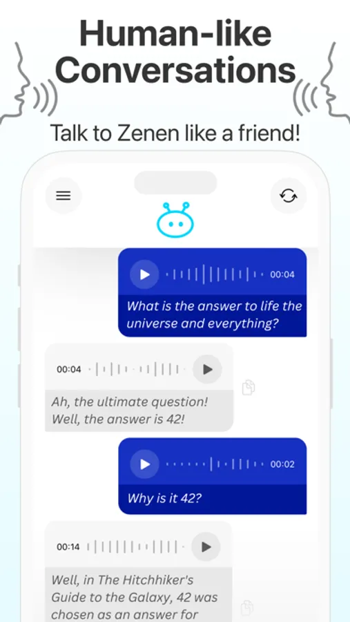 Simply speak to Zenen and listen as it responds in a voice of its own. With advanced language processing technology, Zenen can engage in thoughtful, interactive conversations on a variety of topics, including but not limited to:
