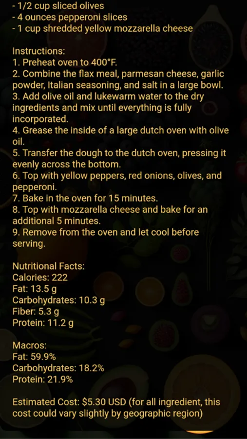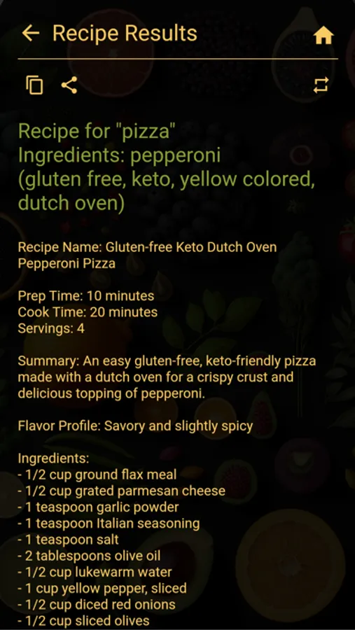 Do you want a yellow colored, spicy, gluten free, keto, pizza, deep dish, with unusual toppings, and made in a dutch oven? The Ai Recipe Explorer app will find and customize the recipe for you! Need the recipe formatted as html, json, markdown, etc? Just add it under additional recipe info, easy! No more endless web searches, dusting off cookbooks, or scrolling through ad ridden food blogs!