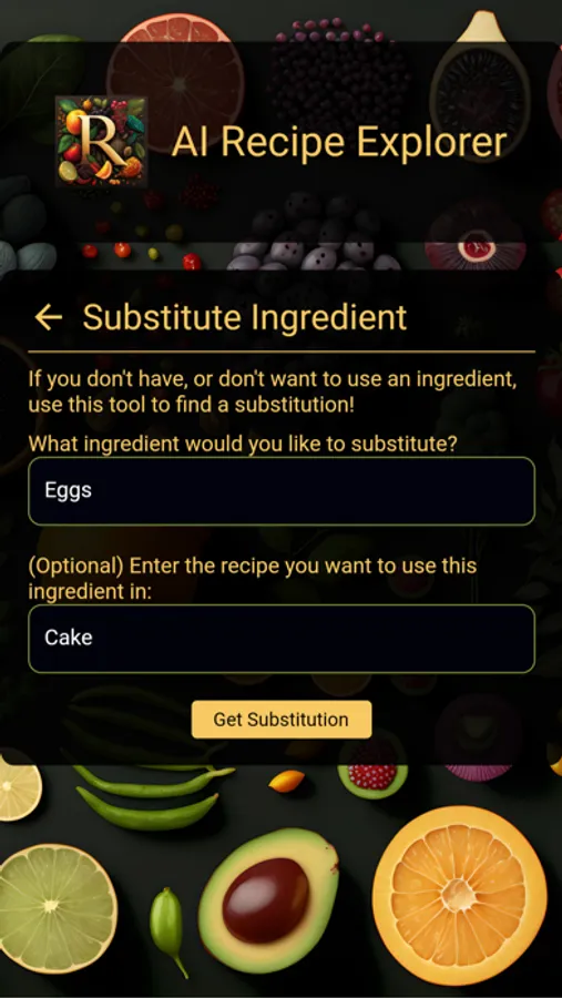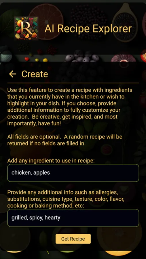The Ai Recipe Explorer app is powered by Artificial Intelligence, which allows you to fully customize and influence your recipe!
