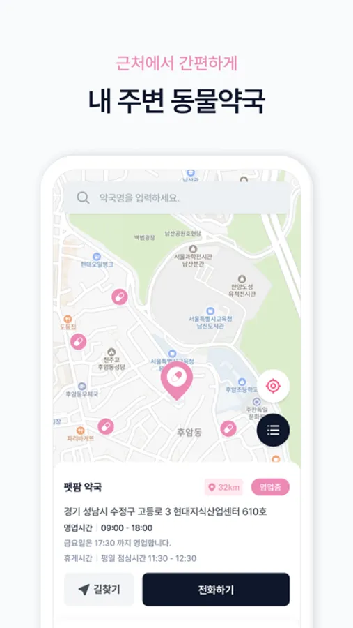 동물의약품 이커머스 회원약국 수 1위! 전국에 있는 펫팜 제휴 약국을 보여드려요.