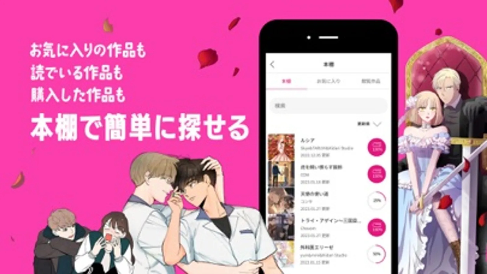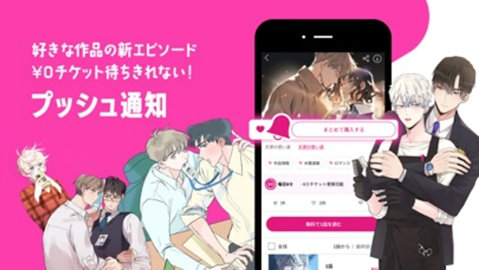 お気に入りの作品や¥0チケットの更新情報が気になる方のためのプッシュ通知!いち早く気になる情報をお届けします! 購入した作品、読んだ作品、お気に入りの気に入る作品を一度に管理できる’本棚’機能も利用できます。