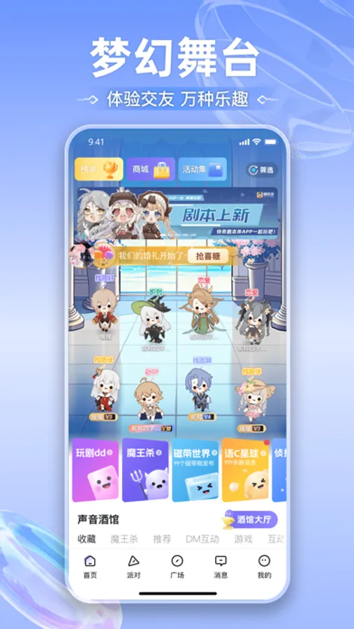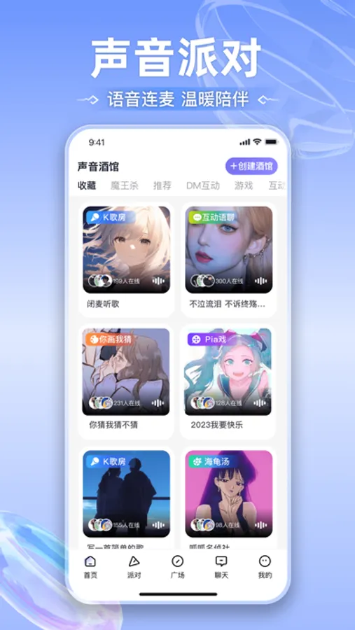 这里有丰富线上互动功能随时随地找到喜欢的声音,遇见懂你的陪伴,相遇知心的守护!专属可爱的虚拟形象,充分展现独特的个人魅力。更有血染钟楼、你画我猜、pia戏、线上KTV等众多玩法,是语音聚会交流的不二选择。
