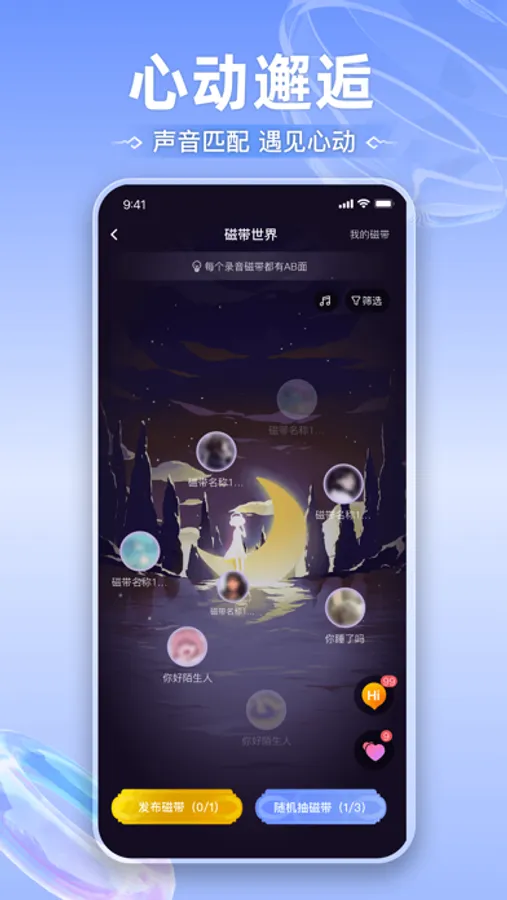 「磁带世界」用声音传递你的内心,分享一个开心的瞬间,透过声音找寻让你心动的TA,邂逅更懂你的陌生人。