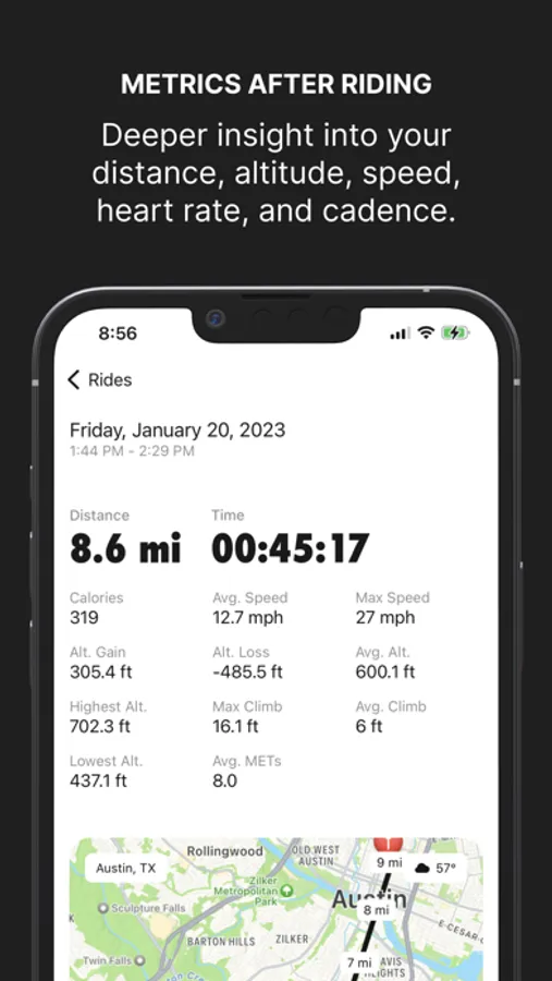When your ride is over, view more details about altitude, climbs, speed, heart rate, and cadance. You can even see your time splits and a map of your route.