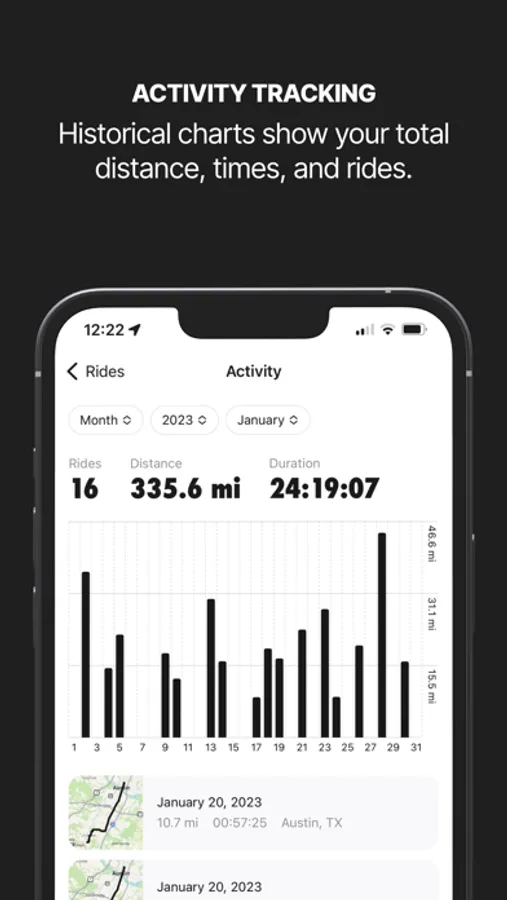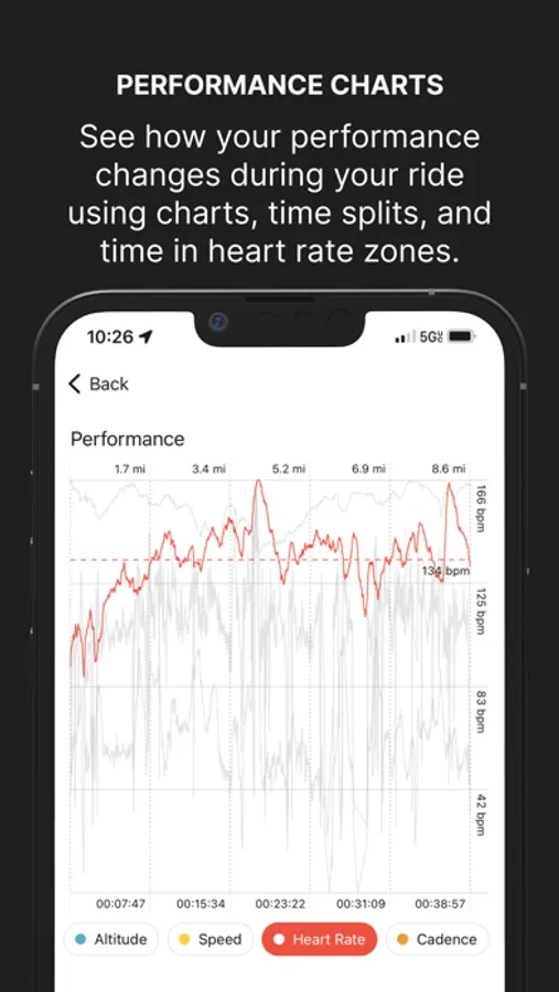 Perform deeper ride analysis in the performance charts. Your duration, distance, altitude, speed, and heart rate are charted so you can see how your performance changes during the ride. And historical activity charts will show how far and long you have ridden.