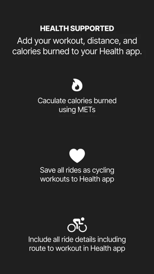 With your permission, all your Health and ride details get saved as a workout to your Health app. Warning: your ride route gets saved with your workout to the Health app. If other apps have permission to read your Health data, then your rides routes can be read by other apps. You can disable the "Workout Routes" permissions in the Health app.