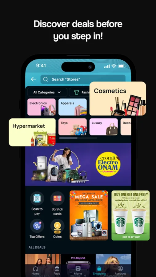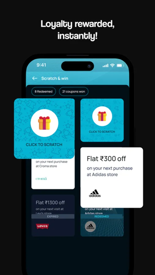 Earn while you shop with our Rewards module. Get rewarded for every purchase made at the mall. Use the scan and pay feature to make payments or upload bills after purchase by scanning. Earn reward points and redeem them for vouchers equivalent to cash at stores. Unlock scratch cards with conditional discount vouchers, making your shopping spree even more rewarding.