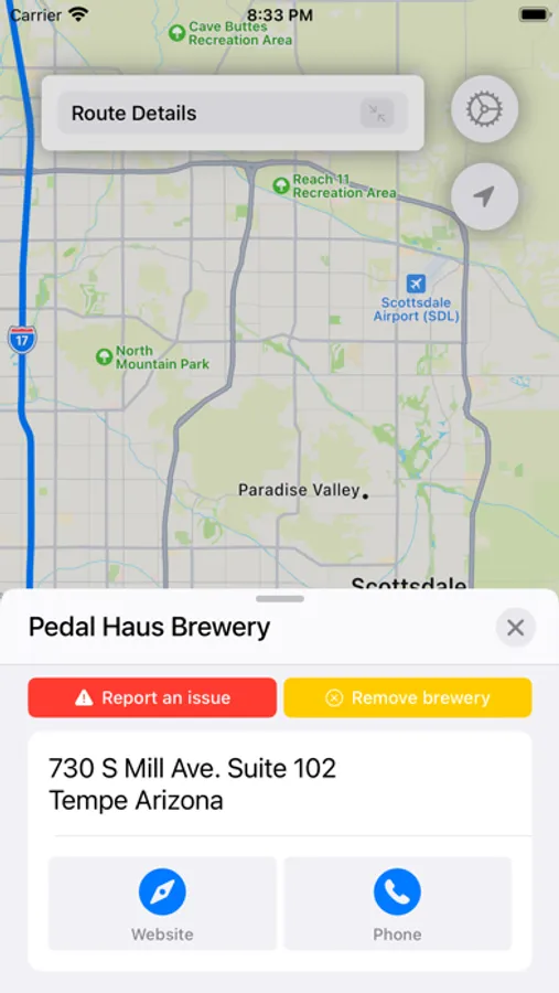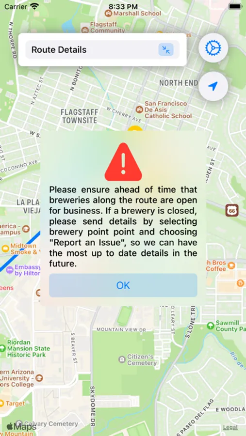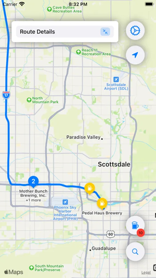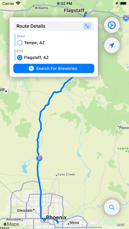 Beer Tour is quick and easy way to find breweries along a specified route. There are several radius options that are available, depending on how far out of the way you want to travel to visit the brewery. Once breweries have been found, select the desired breweries and start your trip!