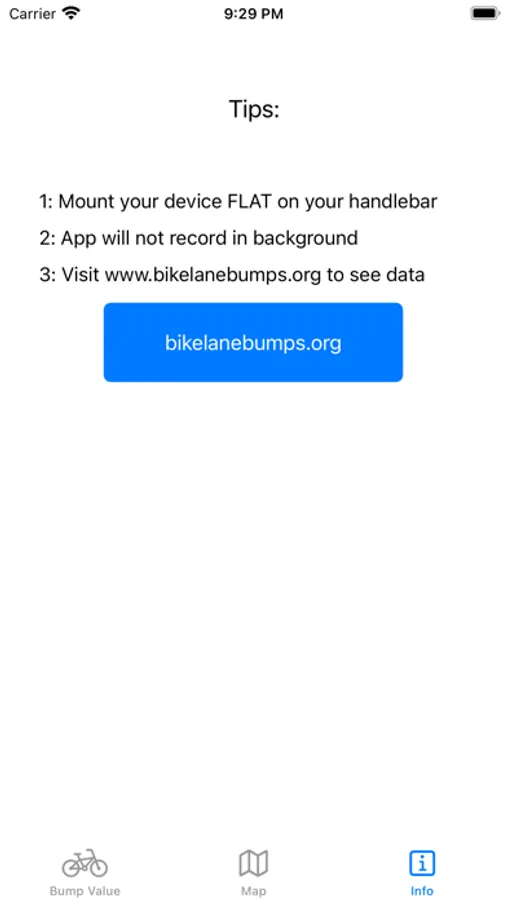 This app measures bumps while you ride your bike. The bump locations and accelerometer measurements are displayed on www.bikelanebumps.com