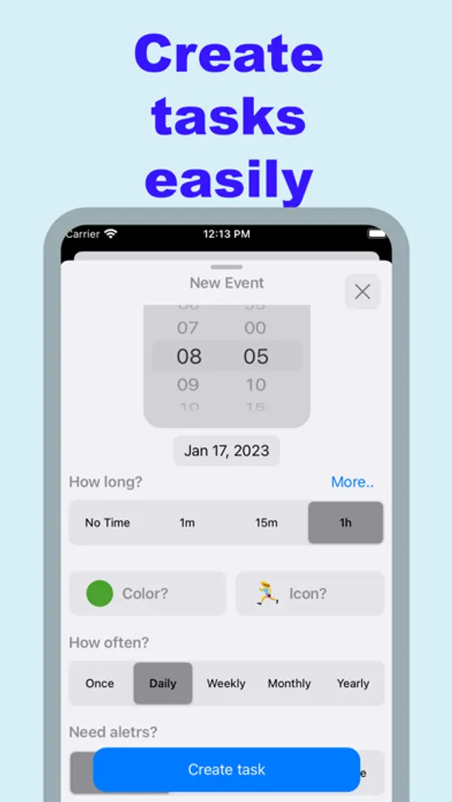 * Choose your own icon and color for each reminders.