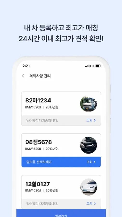 내 차 등록하고 최고가 매칭! 24시간 이내 최고가 견적 확인!