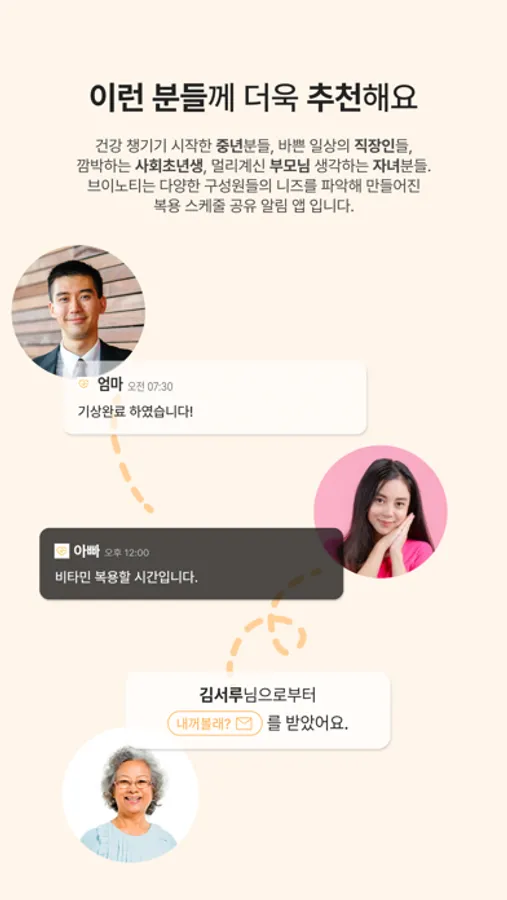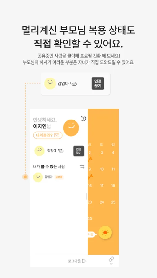 나의 복약스케줄을 친구, 연인, 가족에게 공유하고 함께 복약 스케줄을 관리해보세요!