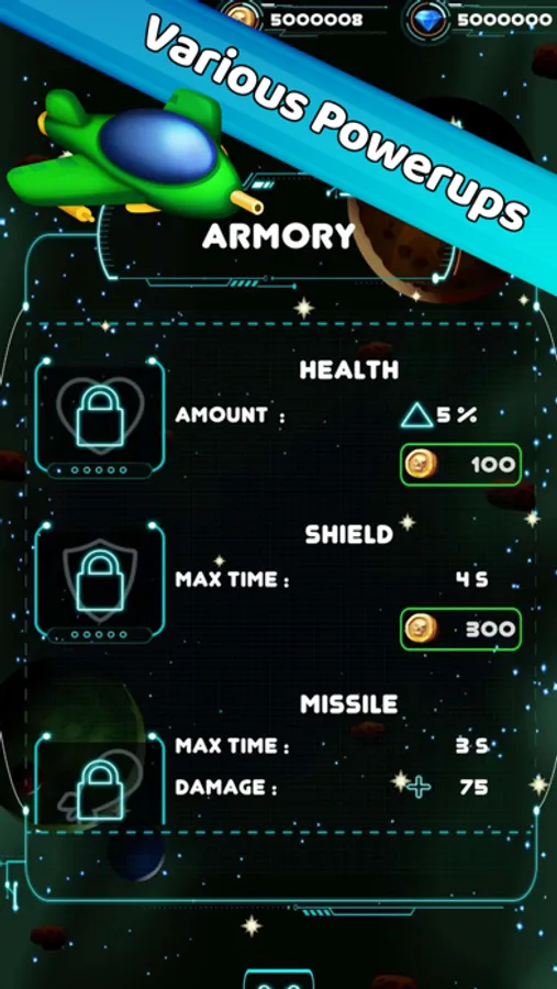 - Buy armoury items to boost your ship's potential. Several powerups to unlock and upgrade