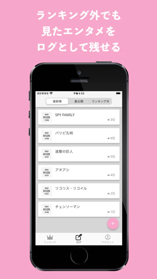 ログは、新着順/最古順/ランキング外のフィルタで表示ができて、日々のログアプリとしても使うこともできます。