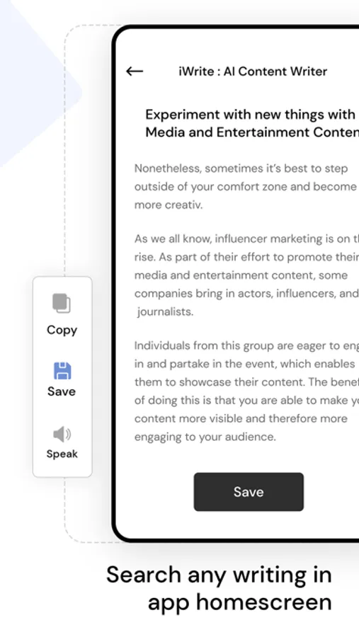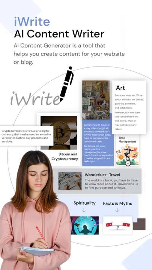 iWrite : AI Content Writer allows you to write blog posts of up to 1500 words in just few seconds. All you need to do is provide a topic and It's a fully automated AI Content Writer that creates articles with little need for editing.