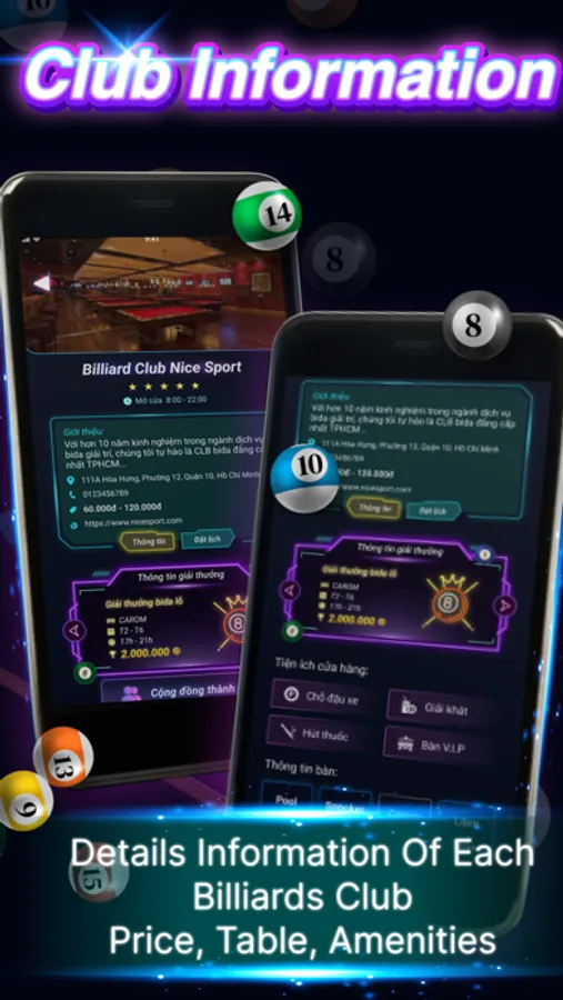 Access comprehensive club details including operating hours, prices, available tables, and amenities