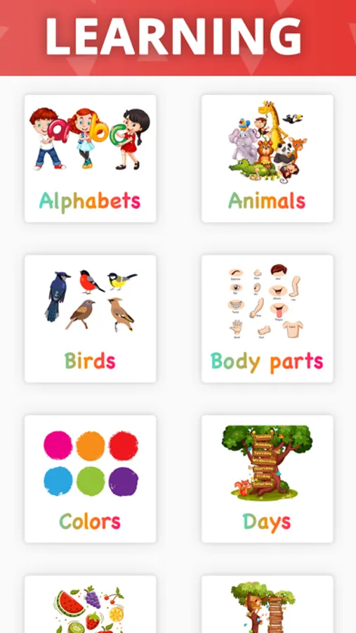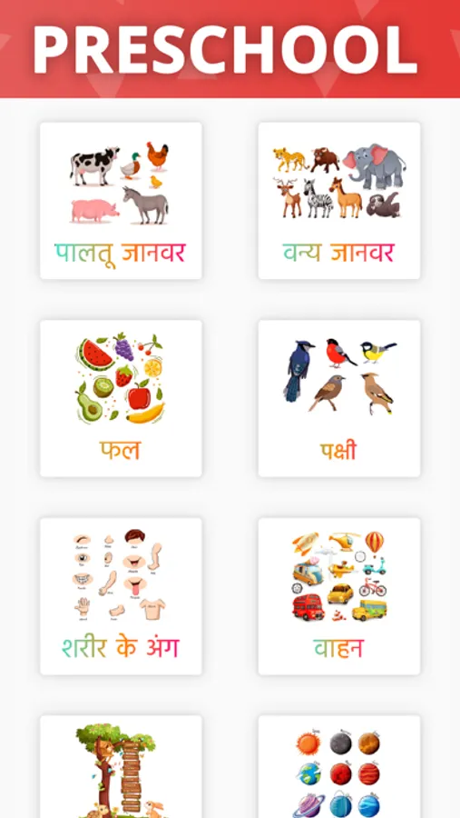 This app is a way of learning for children baby & toddlers or first-time learners with english hindi tamil marathi and gujarati languges support. This app shows various sections like alphabets, numbers, months, the days of the week, fruits & vegetables, food, clothes, flowers, vehicle, birds, animals, colors, shapes, math table, occupations, computer, seasons of the year, school stationery, good habits for children, spelling shuffle games, immunity and nutrition tips.