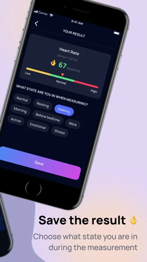 Simply place your finger on the camera to measure your heart rate. Monitor your pulse. Receive reminders to check your pulse and track your vitals on a daily basis so you can stay healthy and fit. Get your stress levels under control and your negative emotional reactions identified and leveled.