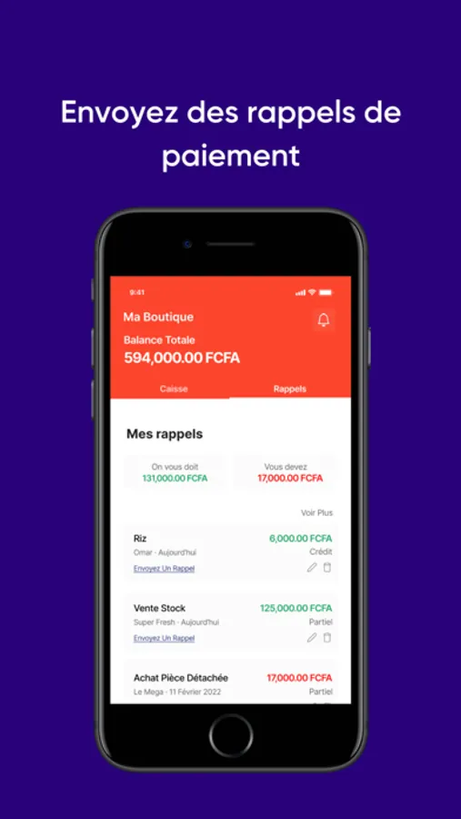 • En cas de crédit ou de partiel, et si l’utilisateur le désire, un rappel automatique de paiement sera envoyé au client par SMS ou WhatsApp avec la date souhaitée,