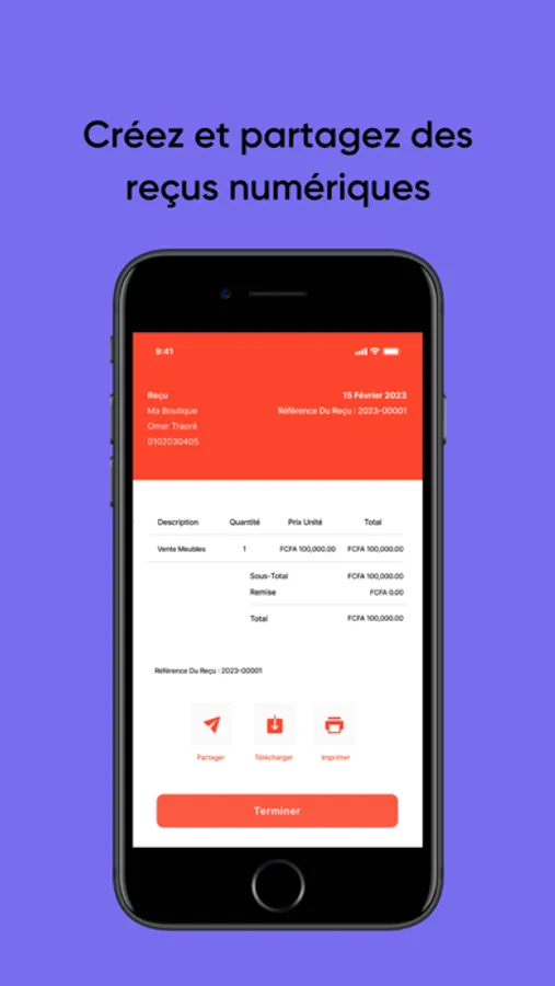 • Le mode de paiement : espèces, mobile money, carte bancaire ou virement.