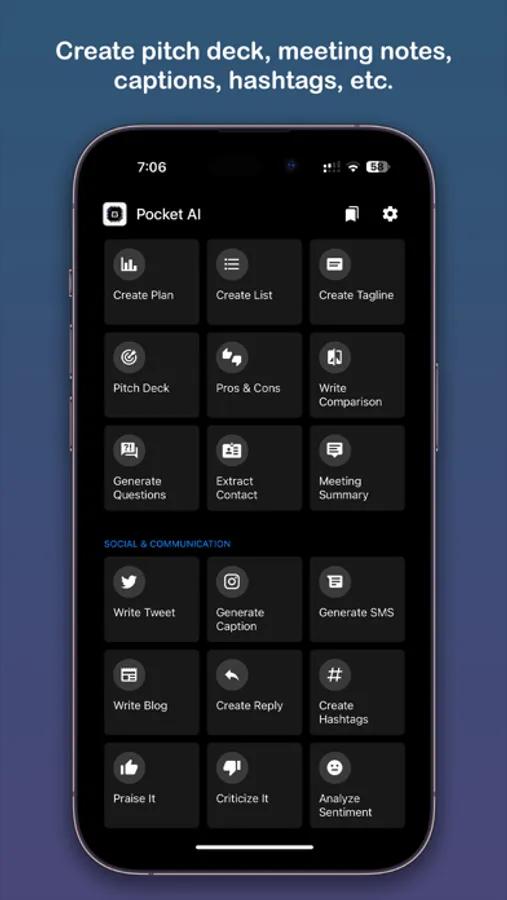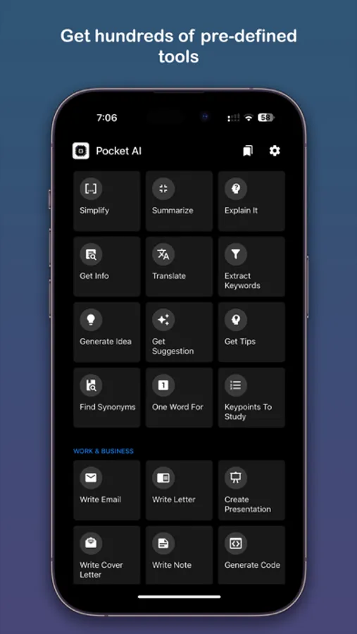 Meet PocketAI, the ultimate AI assistant app is powered by state-of-the-art natural language processing technologies. PocketAI can respond to different questions and perform multiple tasks. Whether you are a student who needs to write a creative essay, or entrepreneur who needs a business idea or logo, or an artist looking for images & inspiration, the PocketAI app is right for you!