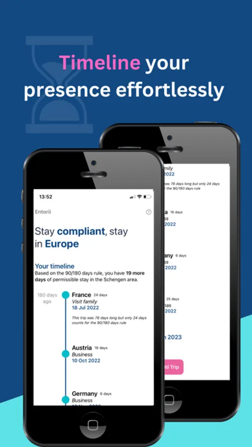 Stay compliant, stay in Europe with Entorii, your ultimate Schengen travel guide. Effortlessly navigate the 90/180-day rule and track your Europe trips to ensure legal stays and avoid visa issues.