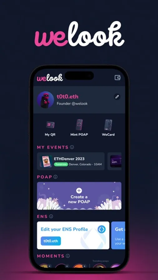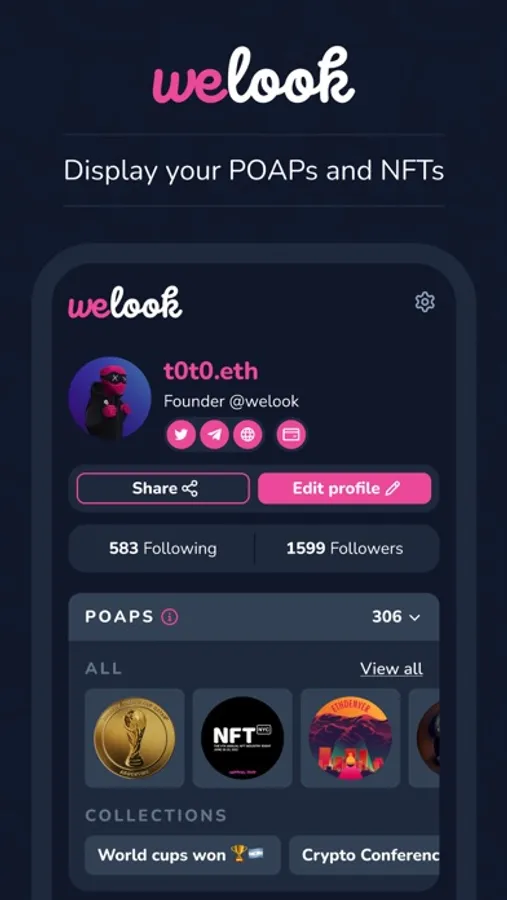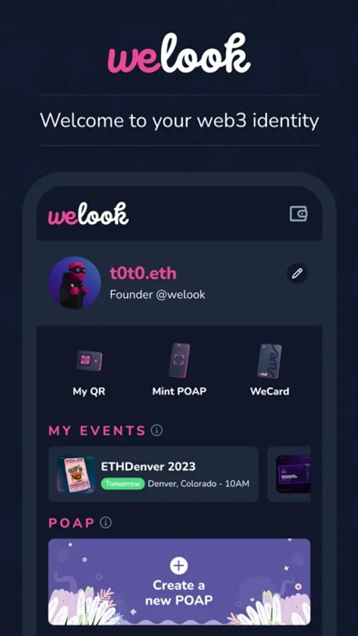 Manager your unique web3 social profile, own your name, follow others, organize your on-chain digital badges and NFTs. Access events with NFT tickets, upload live moments and drop your own custom POAP in less than 5 minutes. Welook is the best social app for web3, granting you the right to show how you want to look with blockchain assets.