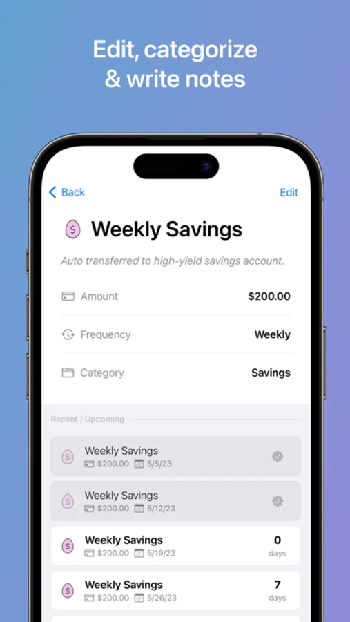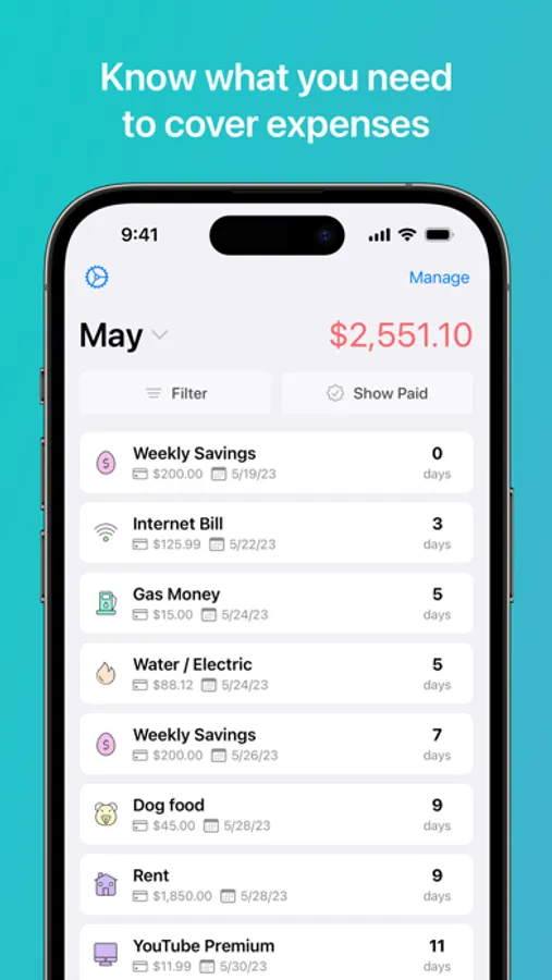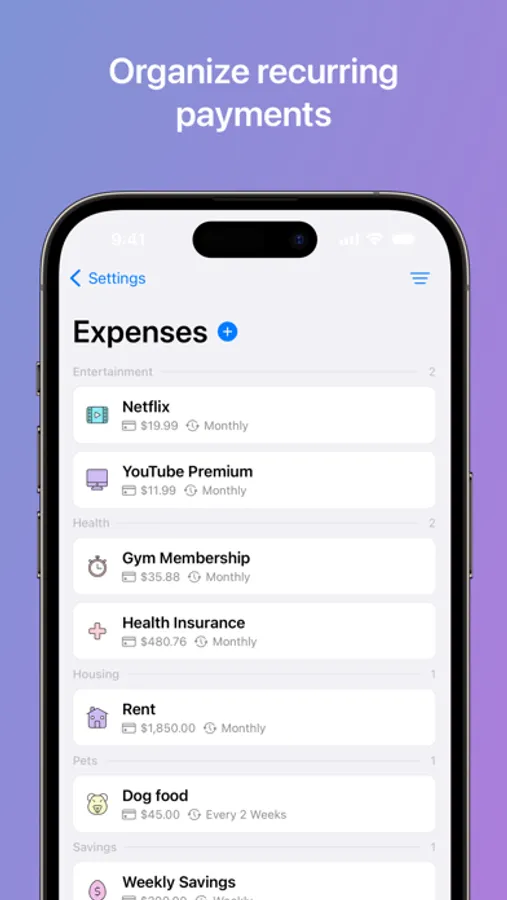Safely manage expenses that occur on a weekly, monthly, yearly, or custom basis, ensuring you never miss a payment.