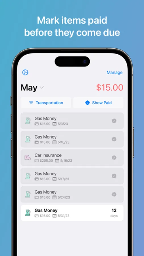 2. Manage payments: Swipe right to mark an expense as paid before its due date or unmark it if you haven't paid it yet. This feature allows you to stay on top of your payment schedule and avoid missing any important payments.