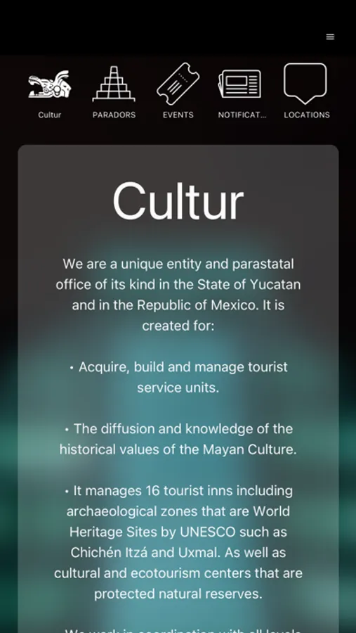 Esta App contiene indicaciones mediante un mapa con rutas detalladas para llegar a los 16 paradores turísticos del estado, desde los ubicados en las principales zonas arqueológicas de Yucatán, así como en las principales playas, centros culturales y sitios ecoturísticos de Yucatán.