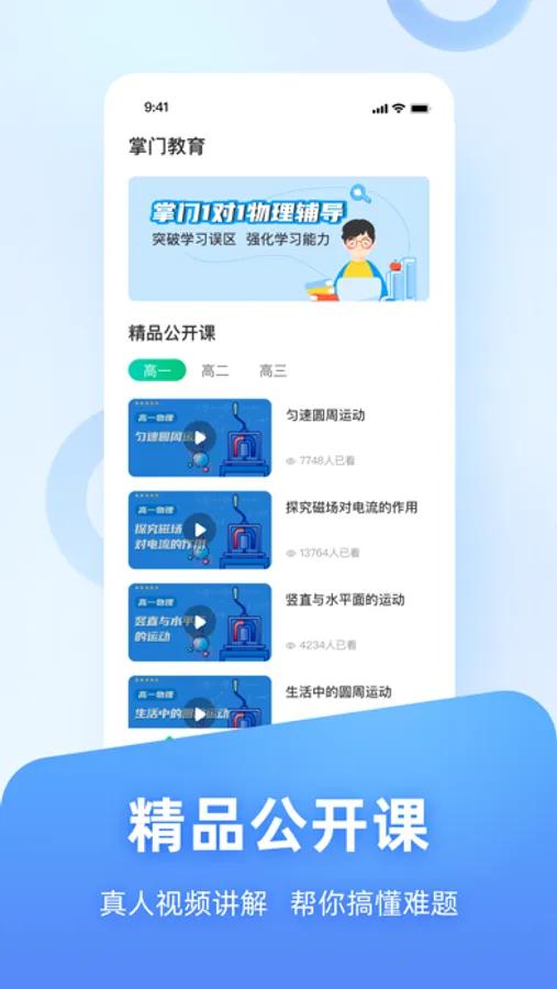 掌门教育是一款集合了高中物理各阶段知识点、重点、易错点、高频考点的在线学习平台,通过强大的Ai技术精准定位物理薄弱环节,1对1量身定制学习方案,专注培养学生解题思维与底层学习能力,全方位解决学习疑问,帮助学生突破高考难点!