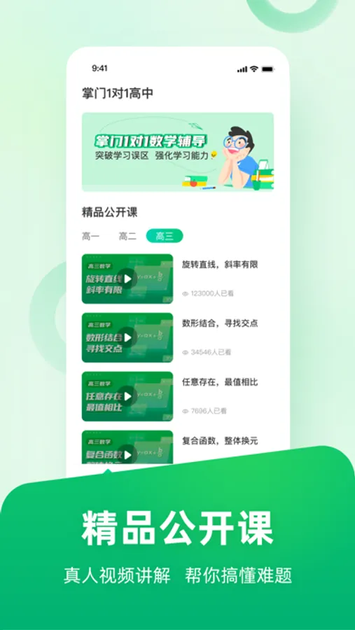 掌门1对1高中是一款集合了高中数学各阶段知识点、重点、易错点、高频考点的在线学习平台,通过强大的Ai技术精准定位数学薄弱环节,1对1量身定制学习方案,专注培养学生解题思维与底层学习能力,全方位解决学习疑问,帮助学生突破高考难点!