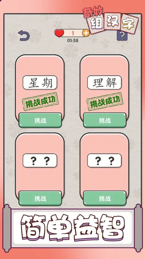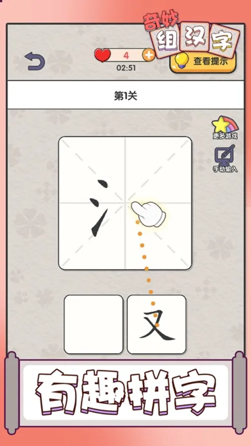 这是一款有趣的拼汉字益智游戏,利用偏旁拼出汉字,可以通过闯关加深对汉字的理解,玩起来十分的轻松解压并富有成就感,游戏的操作简单,拖动偏旁到上方的格子中,将它们组成一个汉字,有些偏旁也可以组成多个字,你能挑战几关呢?