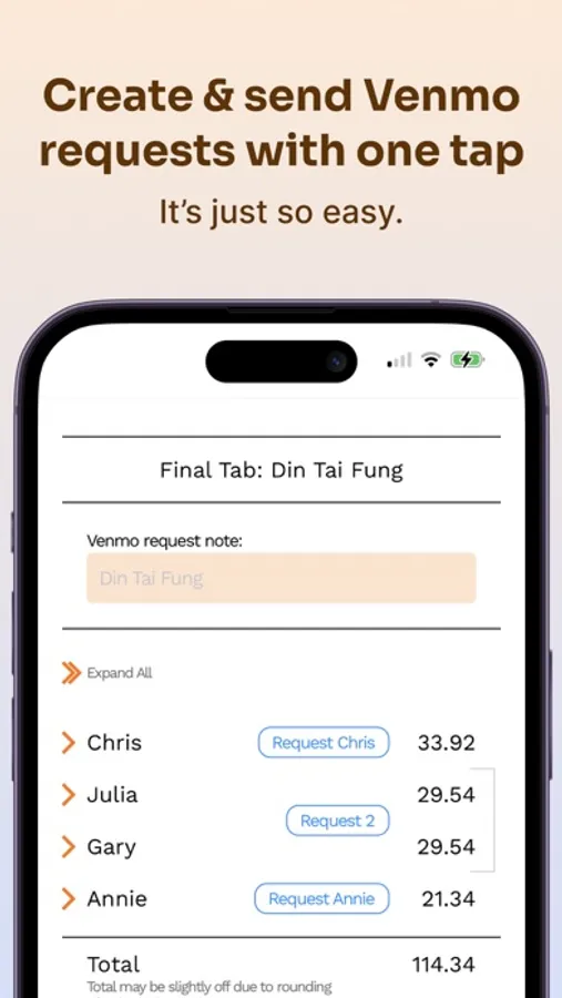 With the tap of a button, you'll be taken to the Venmo app and given a pre-filled request form with all the right info.