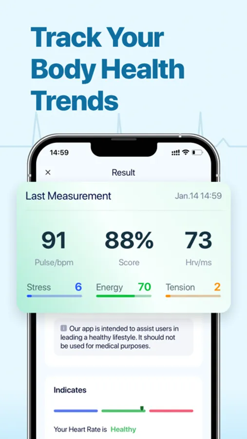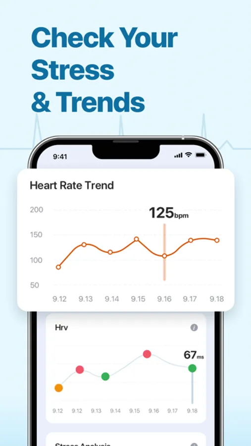 Simply place your finger on the camera to measure your heart rate. Monitor your heart rate, blood pressure and oxygen saturation. Get daily reminders to check your heart rate and monitor your vital signs to keep you healthy and fit. Get your stress levels under control and identify and level out your negative emotional responses.