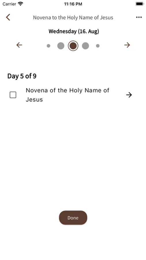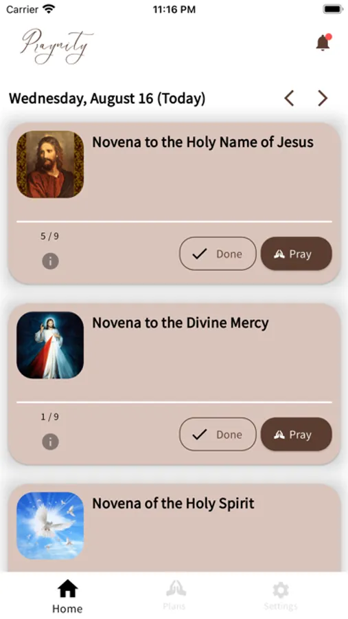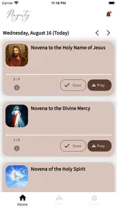 Praynity is an application which contains various prayers and novenas. When you start to pray a novena, it tracks what you have already prayed. You may set notifications so you don't forget to pray.