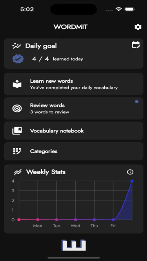 Wordmit tracks your progress in many ways. You can see the progress of your week or the progress of all words and even your day! You can see and manage when to memorize a word completely!