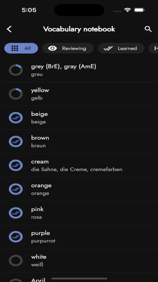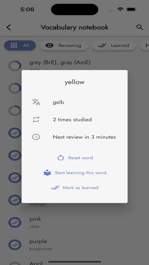 Track your progress, see words and their progress, filter and/or manage words as you wish!