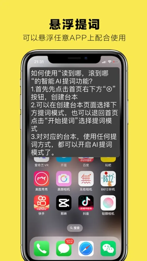 提词器,可以解决您录制视频、发表讲话、视频演说时忘词的烦恼,在录制视频的时候,可以提前将稿子录入到视频提词器中,然后只需要将设备放置到最佳看词区,提词器就会通过语音识别,自动地跟着您的演讲进度进行滚动,让您时时刻刻和您的稿子保持同步。