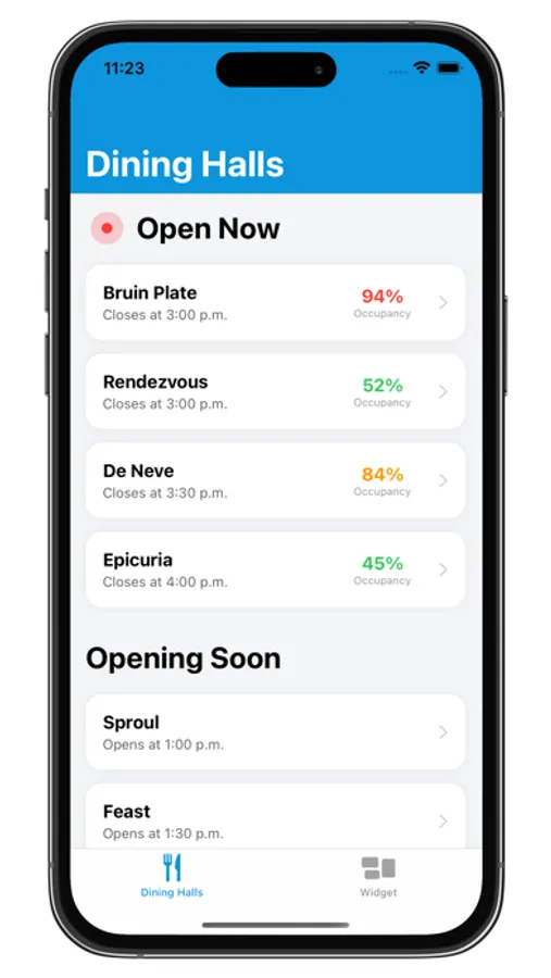 Tired of walking all the way to your favorite dining hall just to be met with closed doors? With BruinDining, you can easily keep track of which dining halls are open, their menus, when they close, and when the next meal will start, both in-app and with the widget.